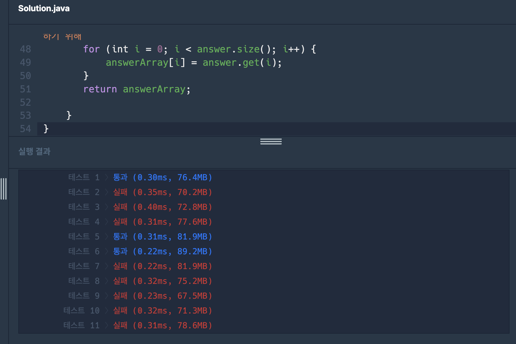 ArraysList로 만든 게 테스트는 통과하는데 실제 문제에서는 통과하지 못해서 의문이다..
