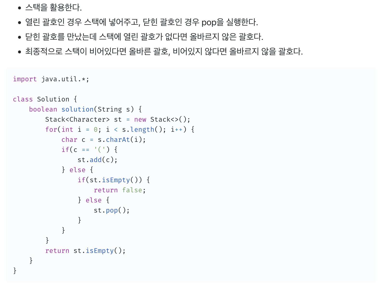if (s.charAt(i) == '(') { // (,) 둘 중 하나만 들어옴