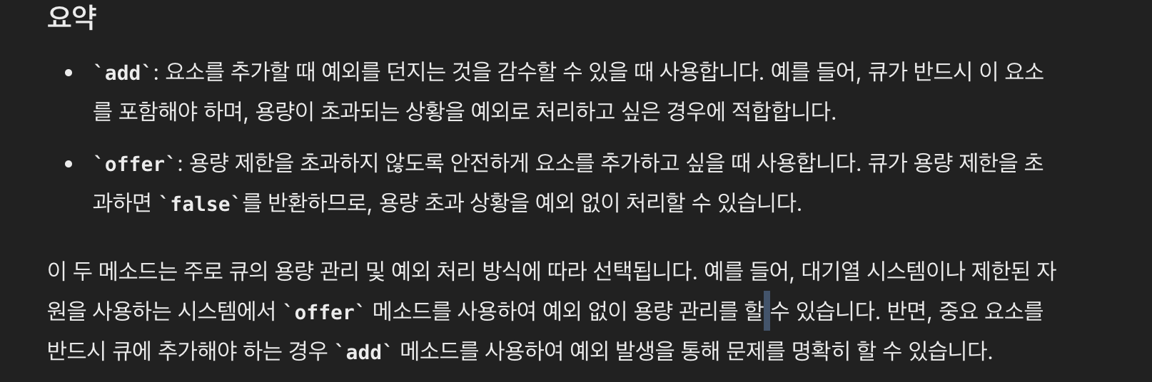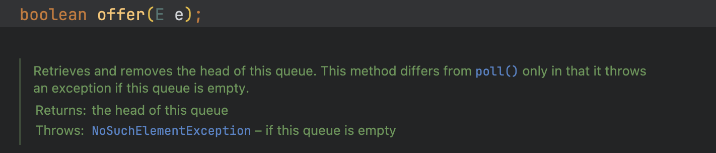 실패 시에 offer는 false를 반환하는 반면, add는 예외를 던진다.