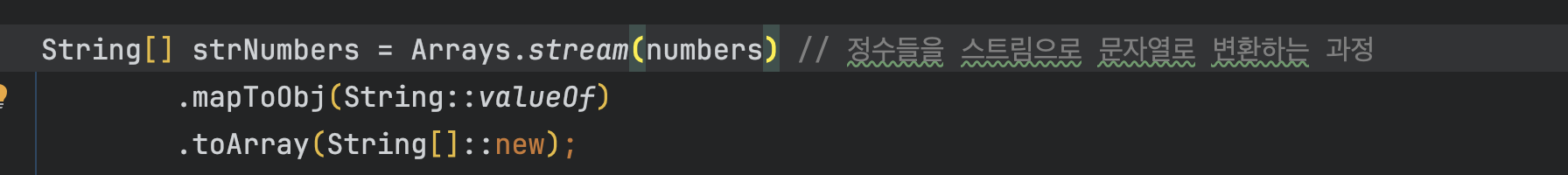 String[] strNumbers = Arrays.stream(numbers) // 정수들을 스트림으로 문자열로 변환하는 과정