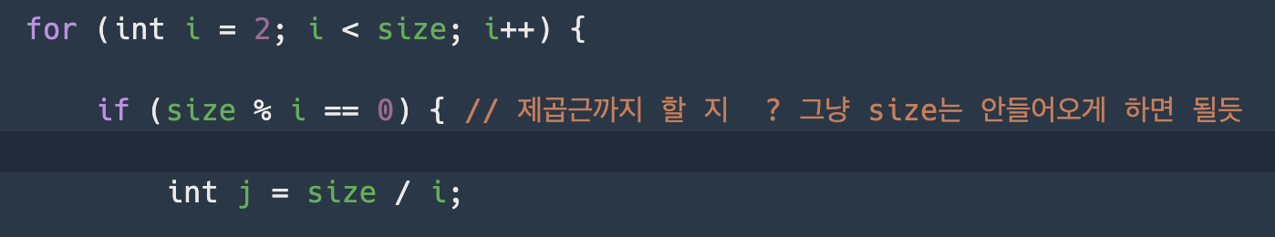 if (size % i == 0) { // 제곱근까지 할 지 ? 그냥 size는 안들어오게 하면 될듯