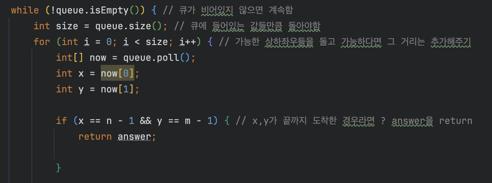 if (x == n - 1 && y == m - 1) { // x,y가 끝까지 도착한 경우라면 ? answer을 return