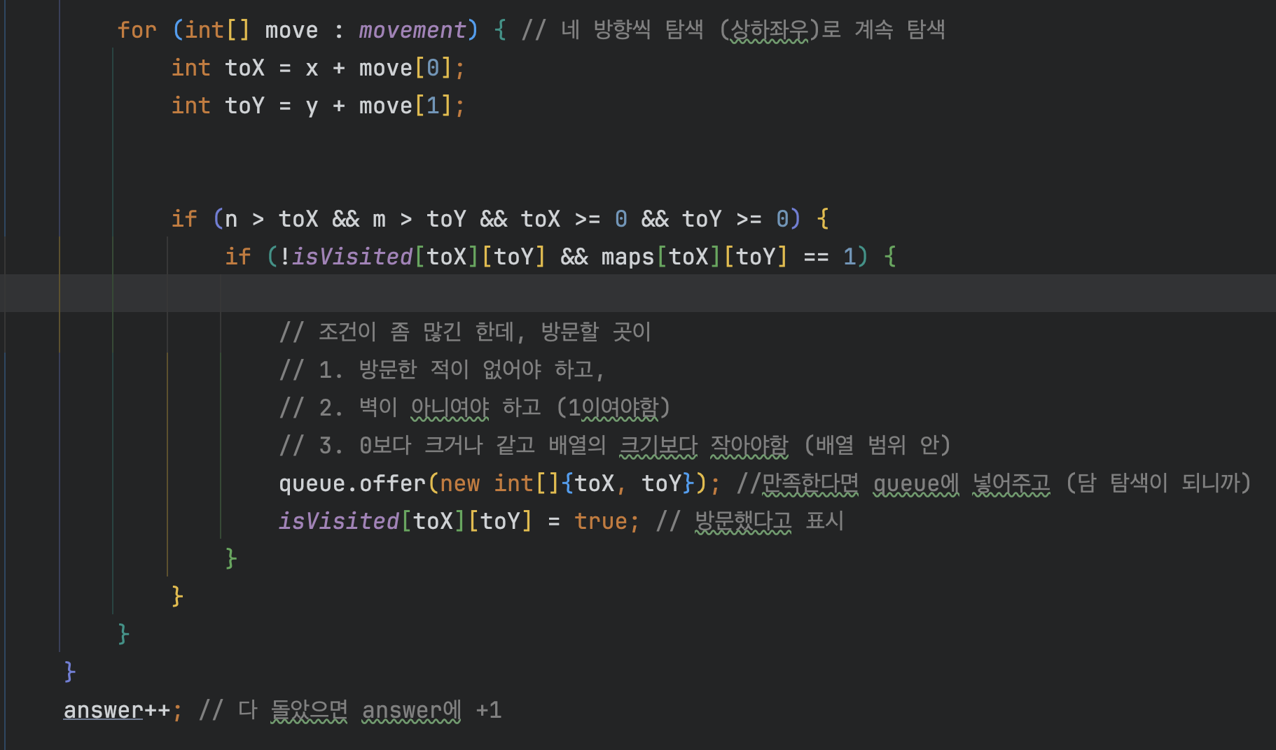 queue.offer(new int[]{toX, toY}); //만족한다면 queue에 넣어주고 (담 탐색이 되니까)