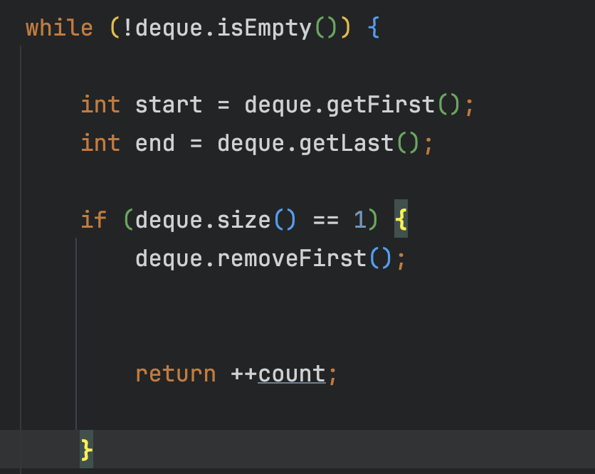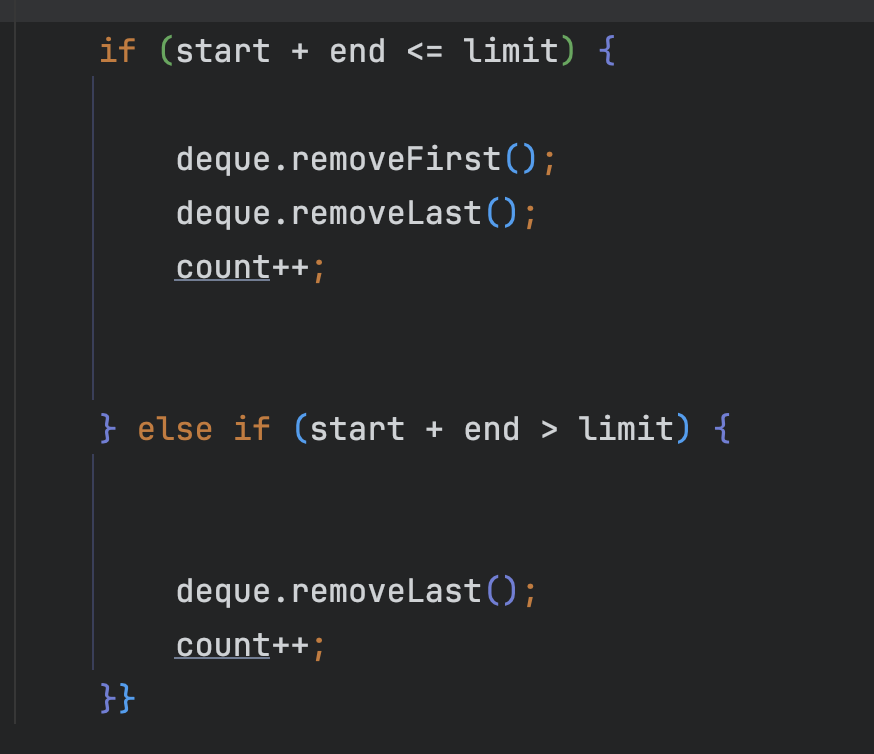 deque의 size가 1이 되면 뽑아오면 같은 수 일텐데 내 조건문을 보면 first와 end의 합이 "limit보다 크냐 or 작거나 같냐" 르수