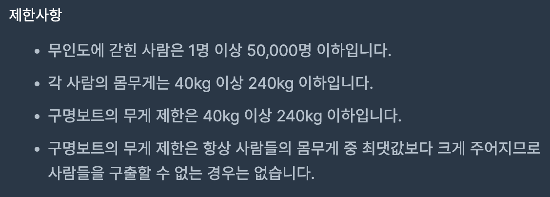 구명보트의 무게 제한이 100kg이라면 2번째 사람과 4번째 사람은 같이 탈 수 있지만