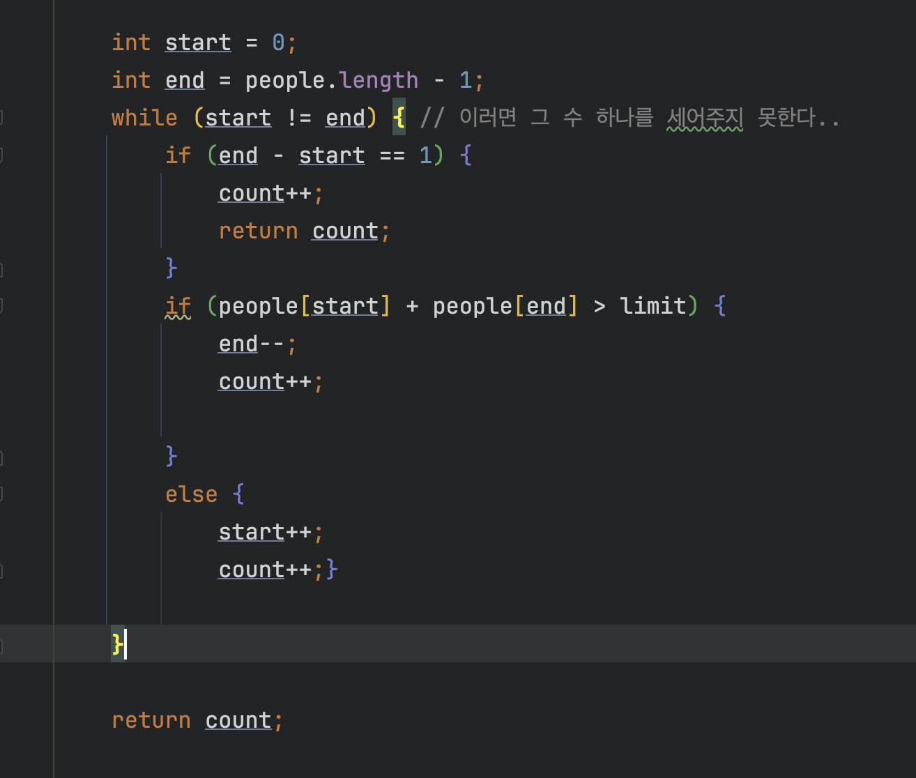 정렬된 배열에서 두 수가 같다면 둘다 한번에 배에 태울 수 있다는 뜻이기에 두 수를 빼주고