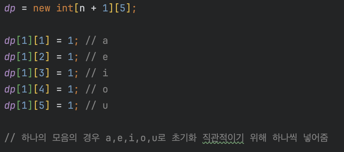 dp 문제인데 aeiou라면 조합 문제인데 중복이 가능하니 중복 조합 ex)5H2 = n+r-1Cr = 6C2 = 15개