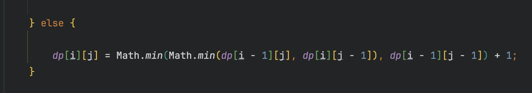 dp[i][j] = Math.min(Math.min(dp[i - 1][j], dp[i][j - 1]), dp[i - 1][j - 1]) + 1;