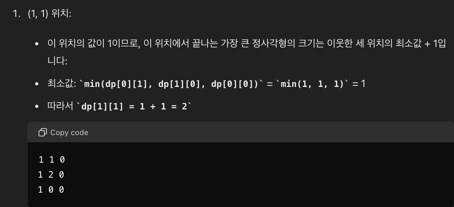 dp[i][j]가 (i, j) 위치에서 끝나는 가장 큰 정사각형인데,