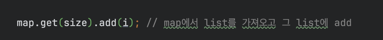 map.get(size).add(i); // map에서 list를 가져오고 그 list에 add