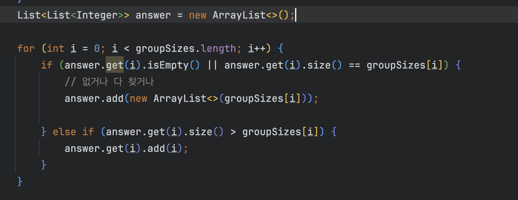 // if (answer.get(i).isEmpty() || answer.get(i).size() == groupSizes[i]) {