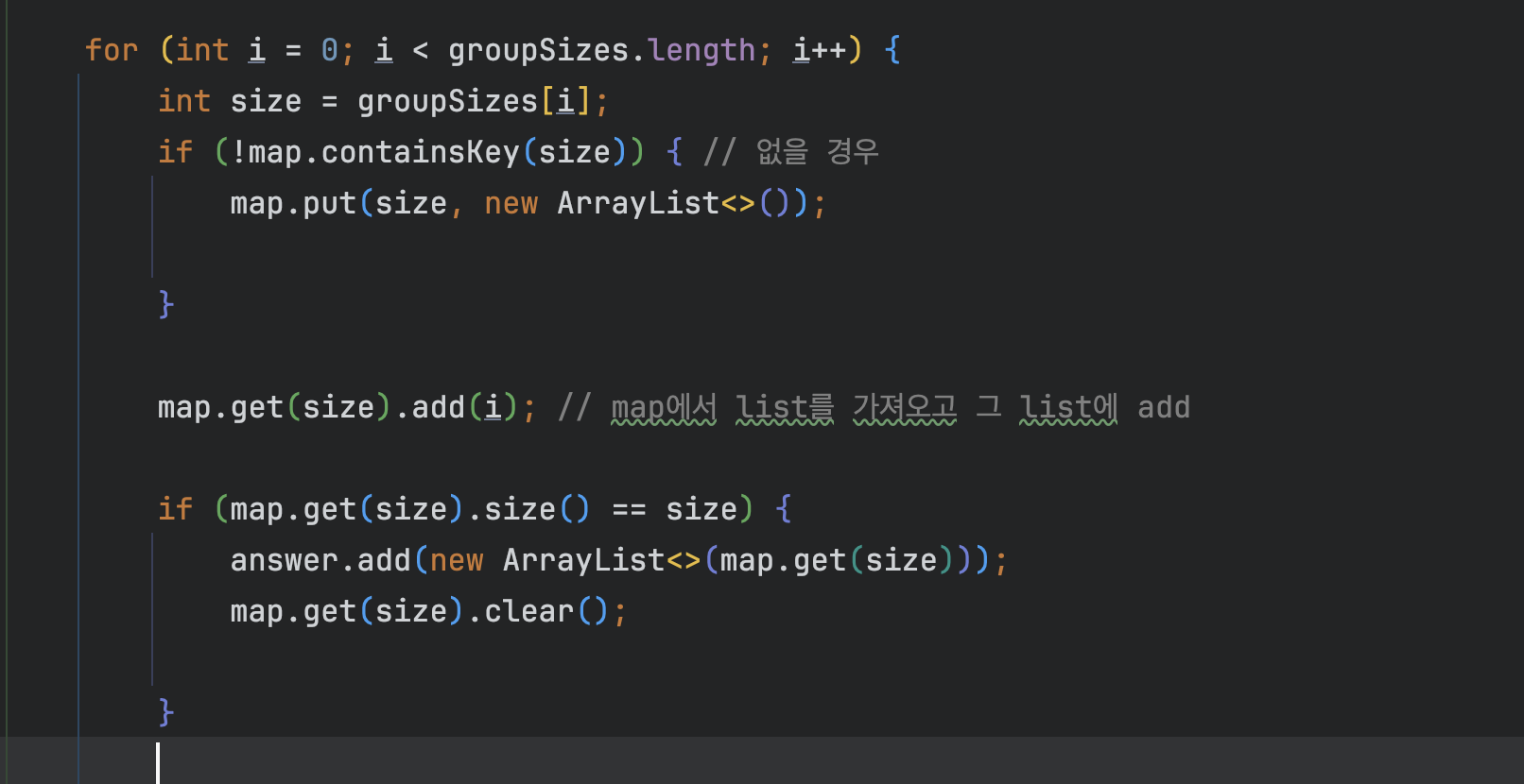 - map.get(3).add(i) map에서 key로 가져와 그 값에 index 추가