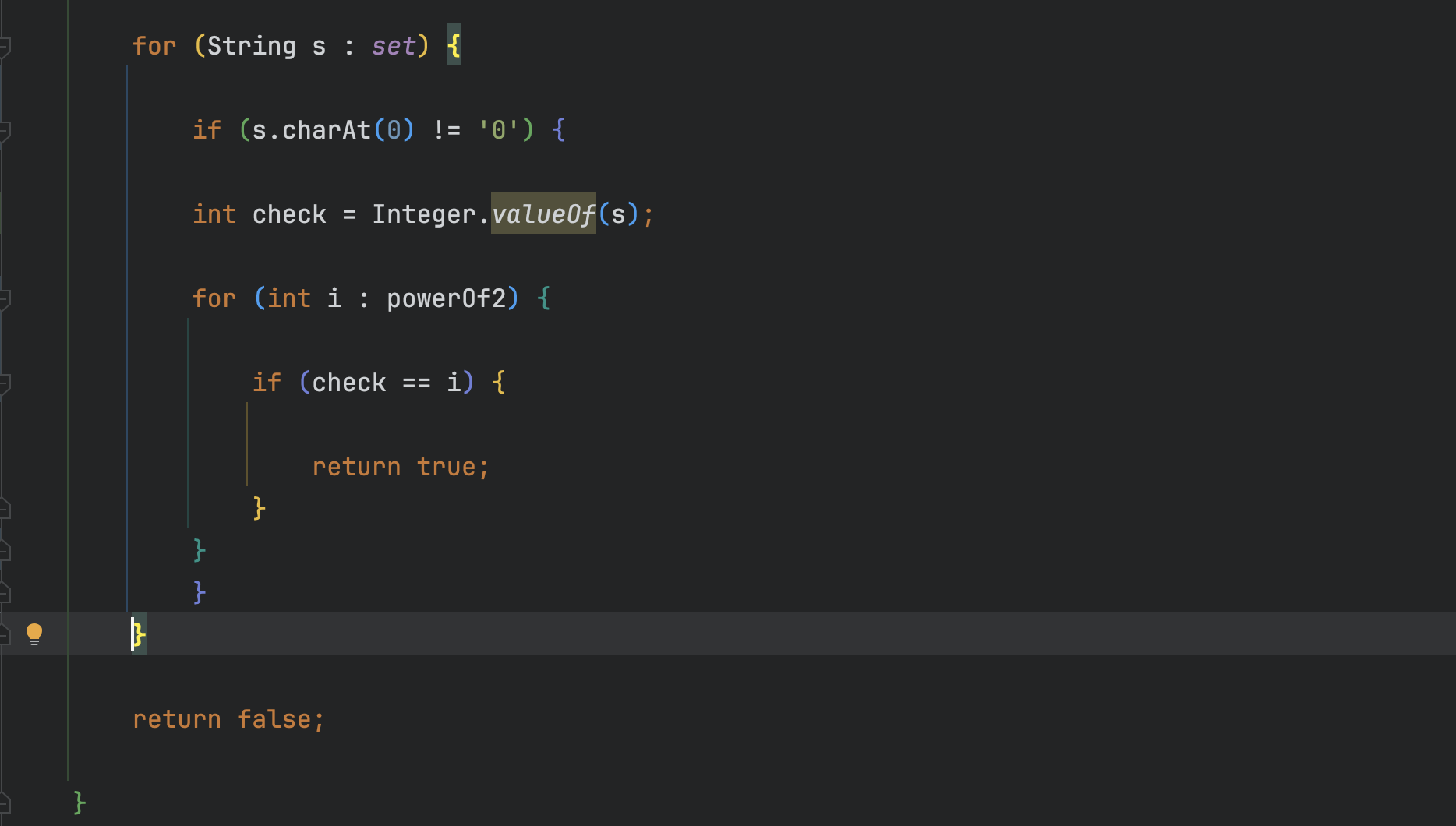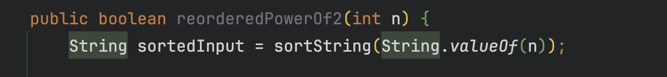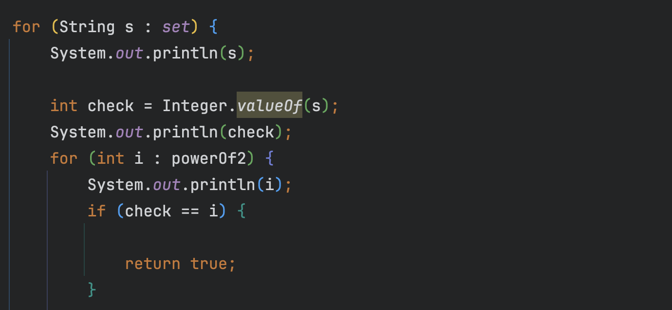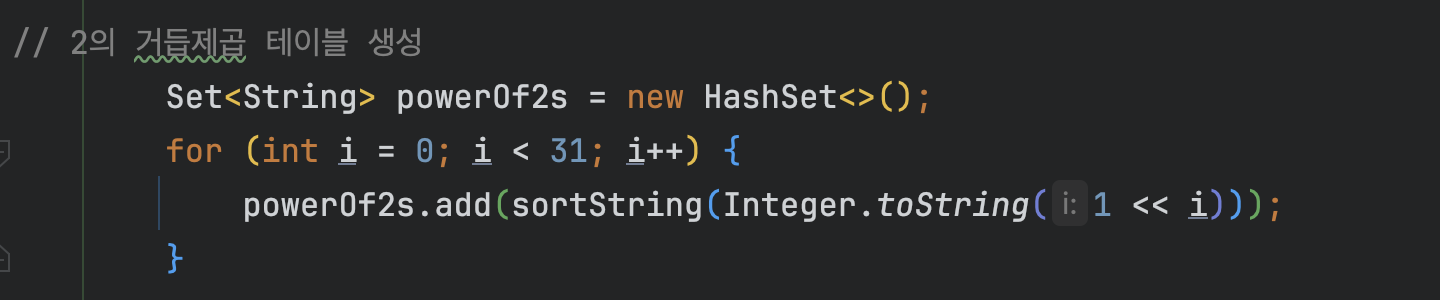 powerOf2s.add(sortString(Integer.toString(1 << i)));