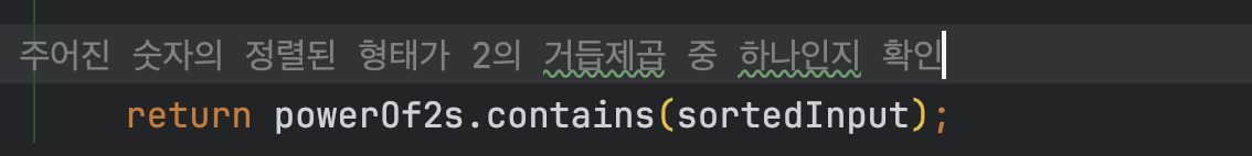 단어들을 재배열 하는데 ex) 12 = '1' '2' 12, 21이 2의 거듭제곱인지 판별해서 반환