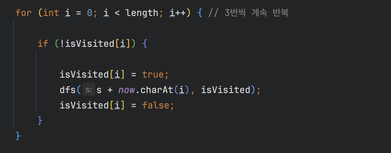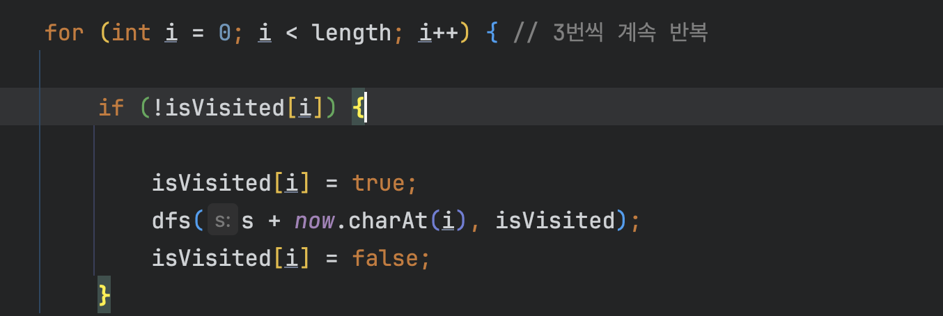 - 호출 시 상태 s = "", s.length = 1 , isVisited = [false, false, false]