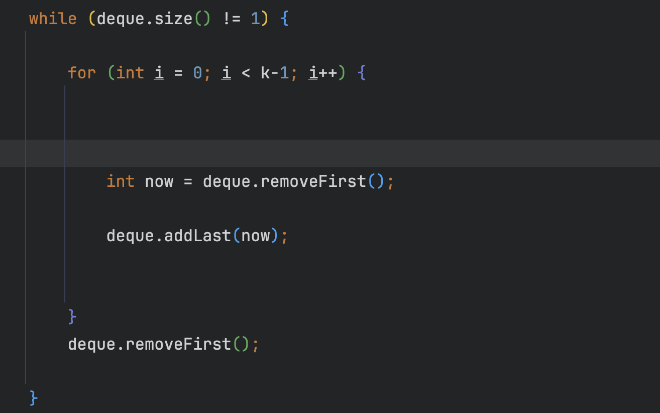 실제 loser(deque에서 제거)는 for문 밖에서 작동하기에 k-1까지 꺼내서 뒤로 넣고, 따로 제거