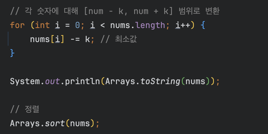 // 각 숫자에 대해 [num - k, num + k] 범위로 변환