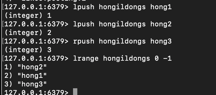 lpush와 rpush 후 hongildongs에 저장된 list 확인