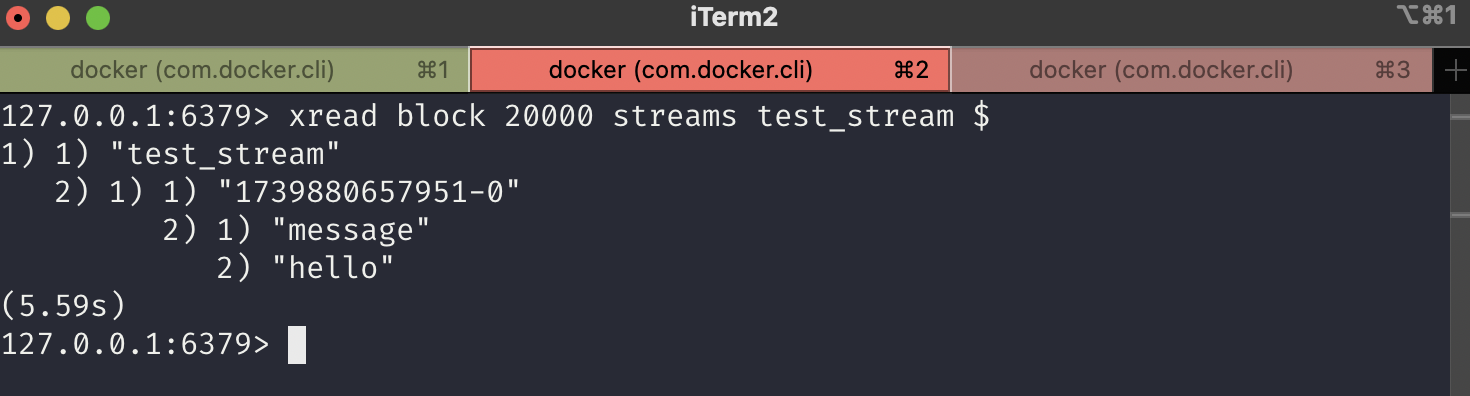 - XREAD BLOCK 10000 STREAMS test_stream $