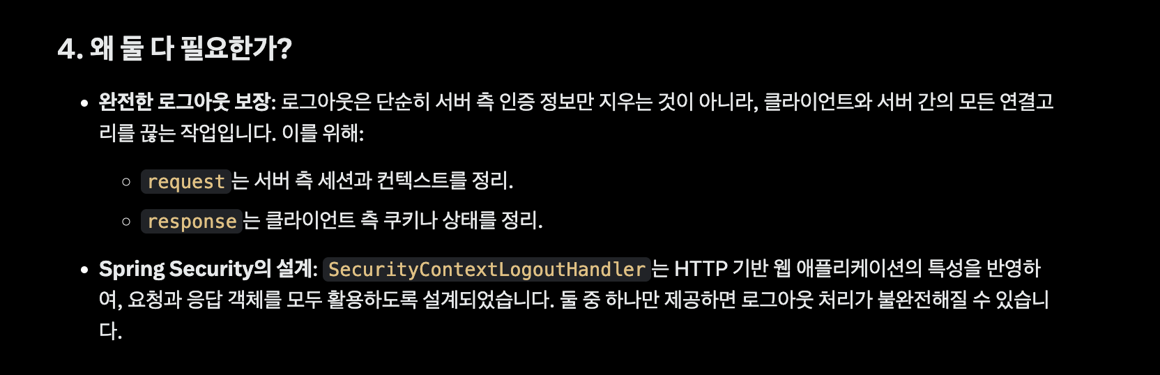 request와 response를 둘 다 넘기는 이유는 Spring Security가 로그아웃을 완벽히 처리하기 위해 서버 측(세션)과 클라이언트 측(응답)을 모두 제어해야 하기 때문입니다. 이는 HTTP 프로토콜의 특성과 보안 요구사항을 충족하기 위한 설계입니다. 만약 세션만 종료하고 응답을 조작하지 않으면, 클라이언트 측에 남아있는 쿠키나 상태로 인해 보안 문제가 발생할 수 있습니다.