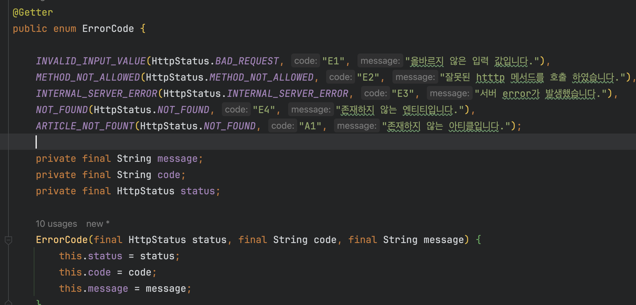 에러 코드를 한 곳에 모아 관리하기 위한 enum class