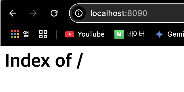 폴더가 마운트돼서 index of/로 나옴 (아무 것도 넣지 않고 폴더만 넣은 상태)