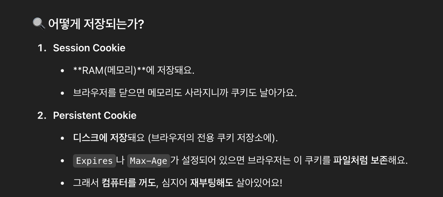 각 도메인 별로 관리하고 그래서 csrf 방어가 중요!! RAM(메모리)에 저장되는 게 아닌 디스크의 저장 디스크에 저장 (브라우저의 전용 쿠키 저장소에)