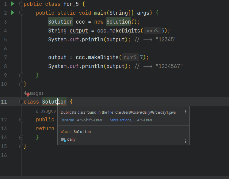 동일 패키지 내에서 같은 Solution 이라는 클래스가 여러번 중복되는 오류가 발생한다.
