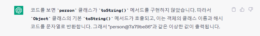 내가 원하는 결과 값을 얻으려면 오버라이딩된 toString() 메서드를 내가 직접 재정의해서 내가 원하는 사람의 이름과