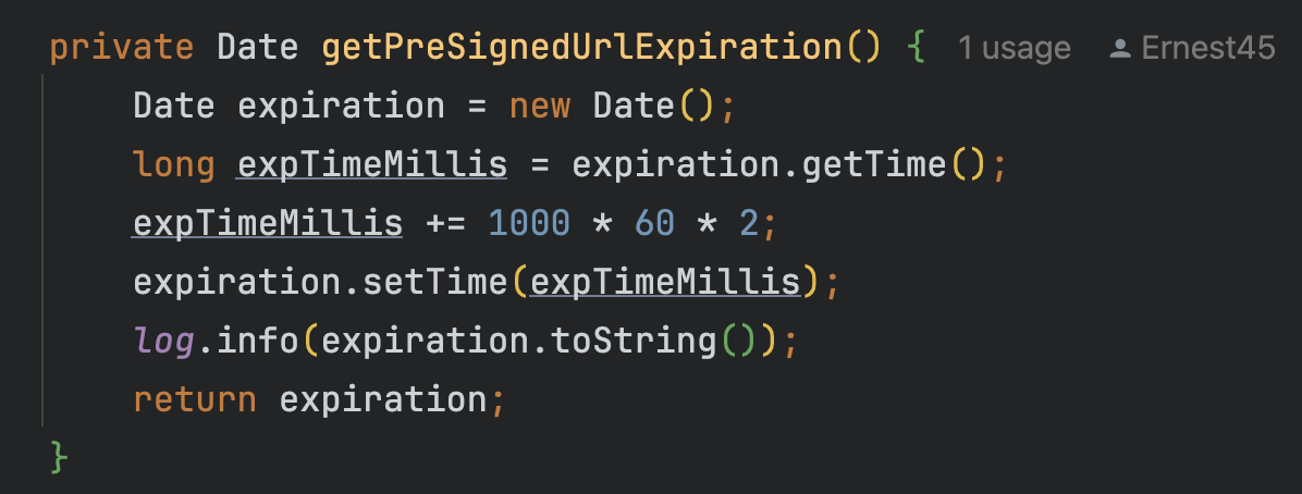 보안을 위해 만료 시간 설정 - getPreSignedUrlExpiration()에서 가져온다