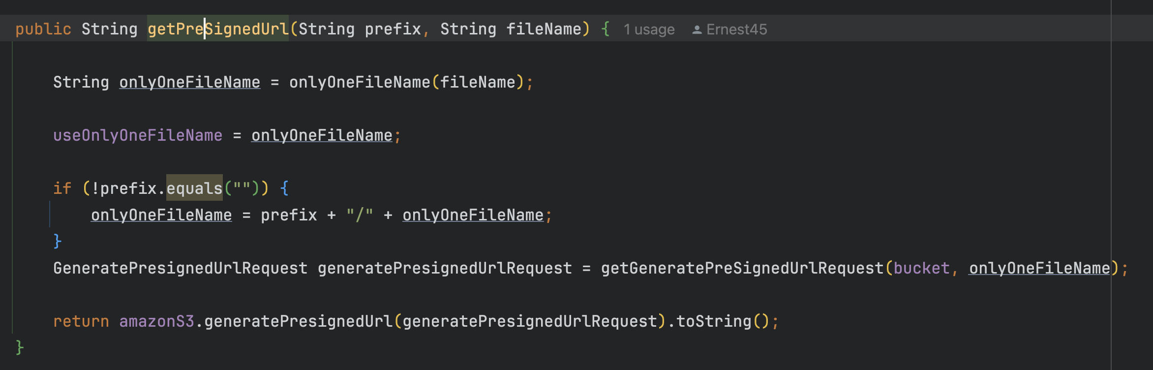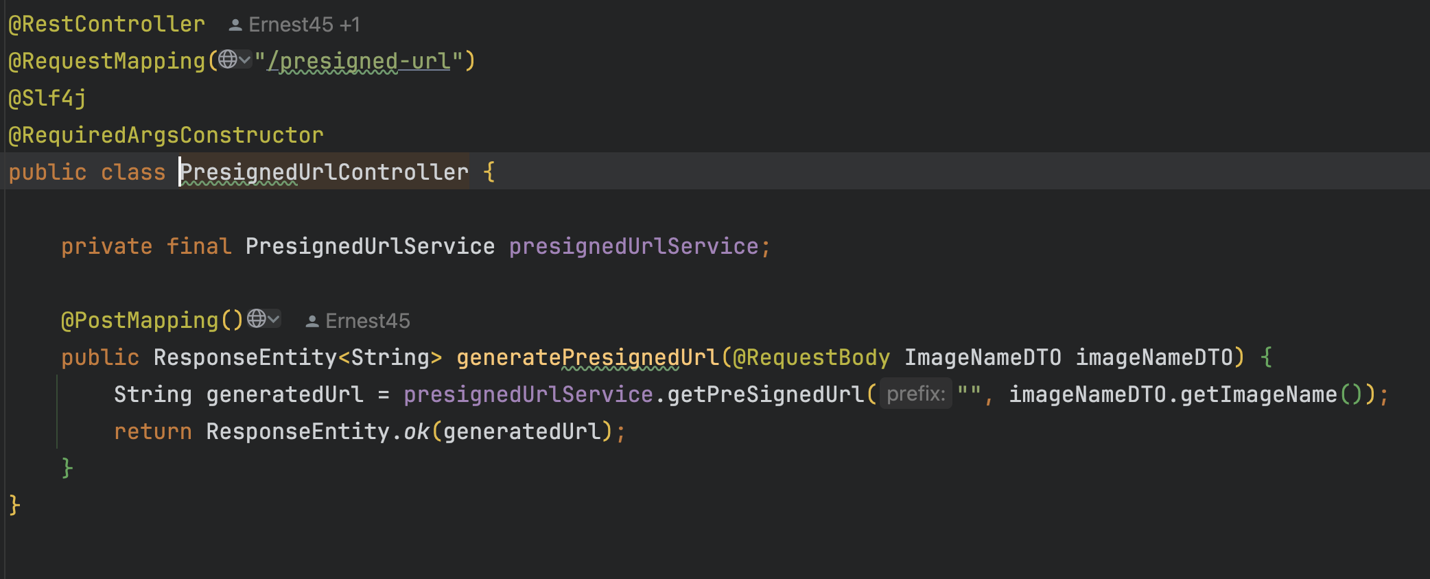 String generatedUrl = presignedUrlService.getPreSignedUrl("", imageNameDTO.getImageName());