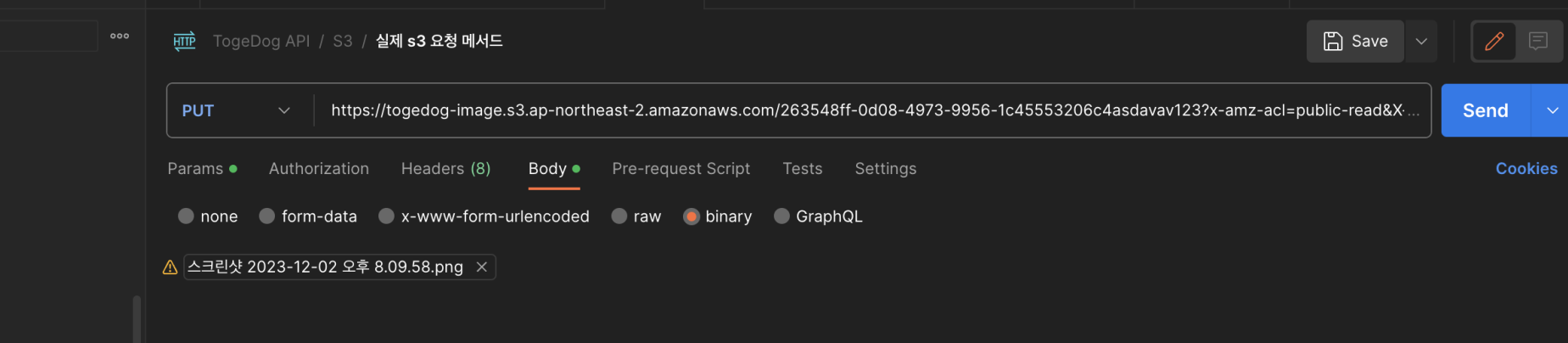 클라이언트에서는 이 서명된 URL로 PUT 요청으로 사진을 보내면 s3에 저장된다.