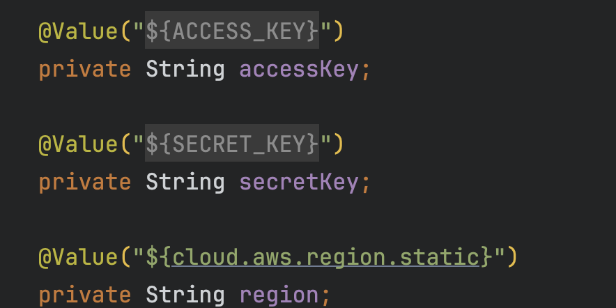먼저 s3에 접근하기 위한 accessKey와 secretKey region이 필요하다.