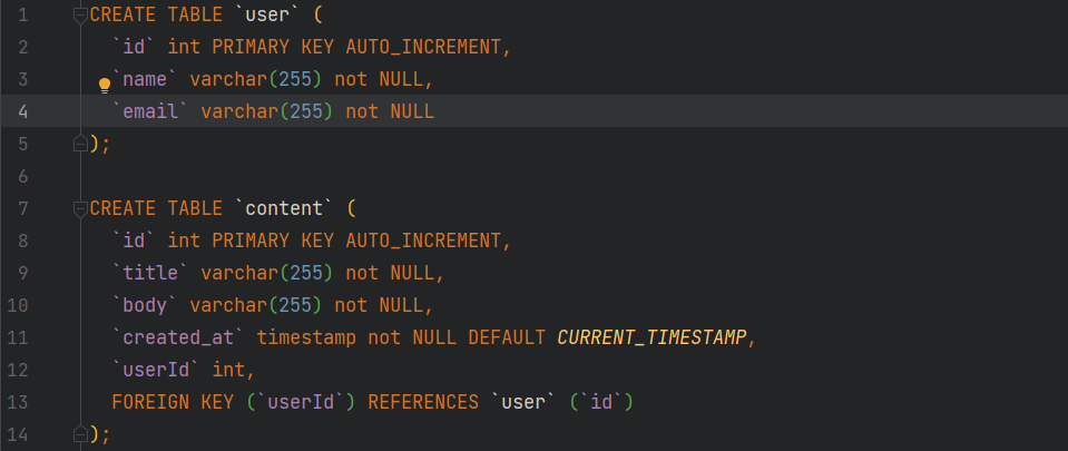 TABLE을 추가할 때 먼저 `user` 테이블과 `content `테이블을 생성하였다.