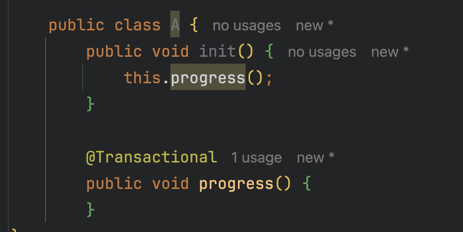 @Transactional progress()를 내부적으로 부르는 경우에는